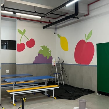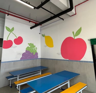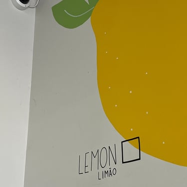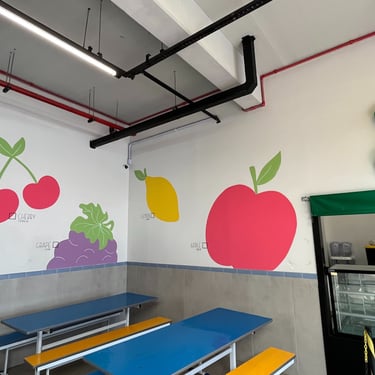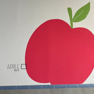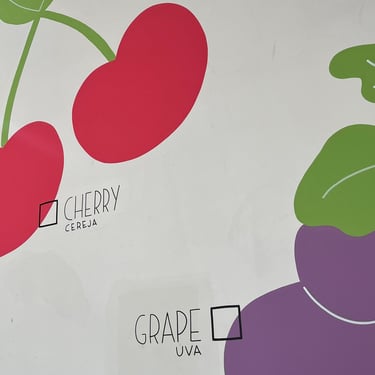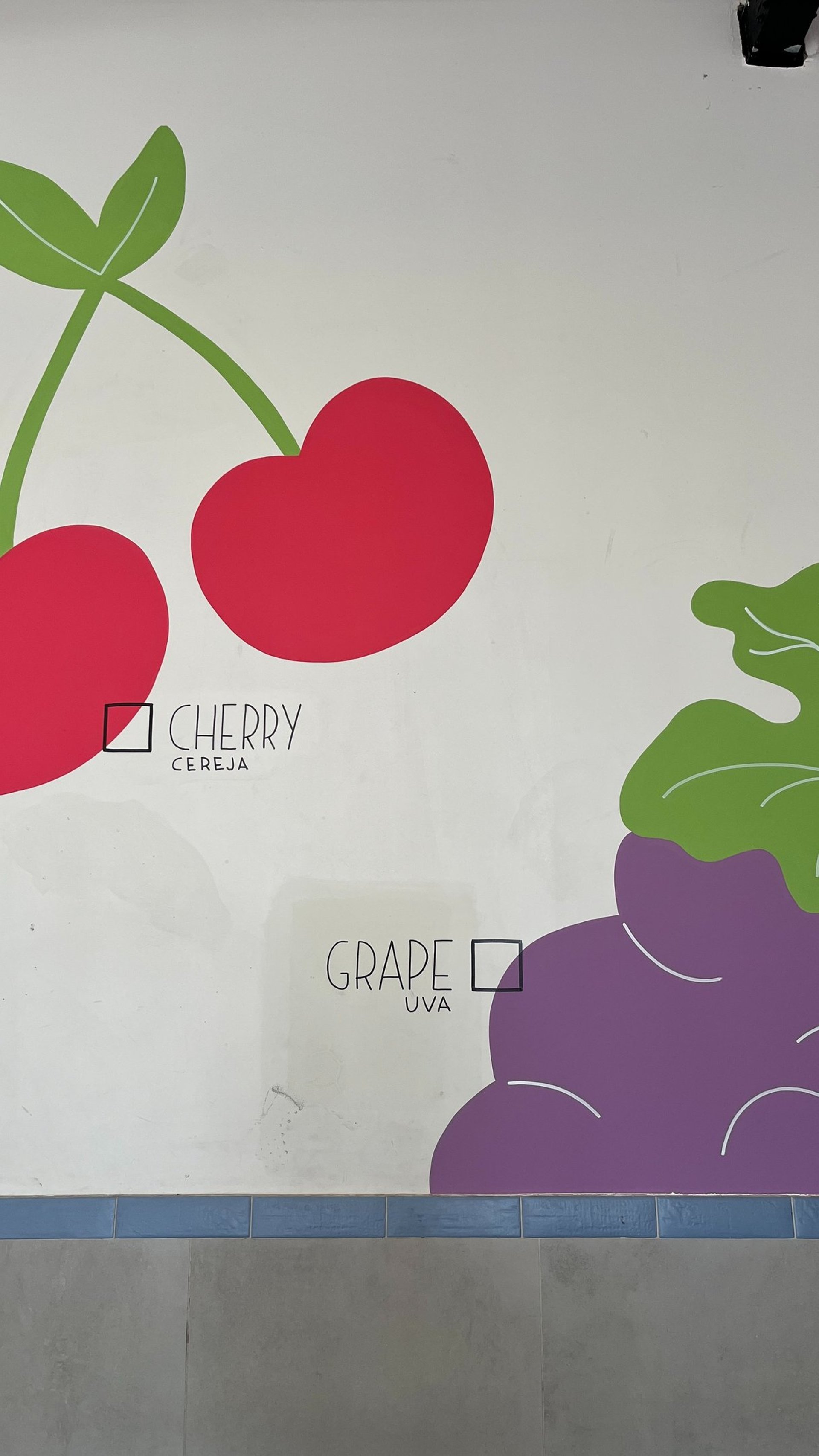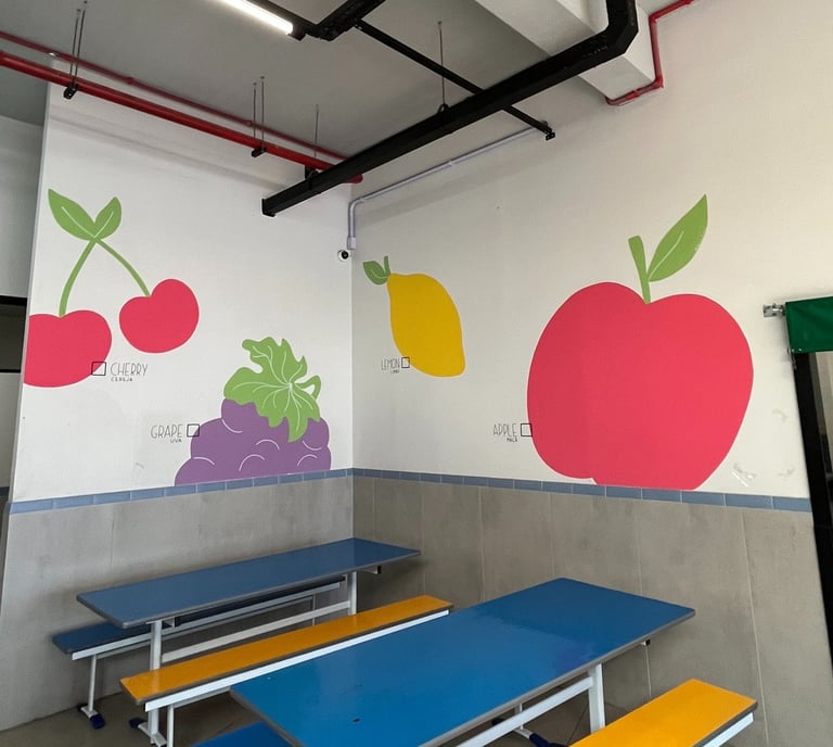 Espalhamos algumas frutas no espaço externo da cantina e adicionamos o nome em inglês junto com a tradução.