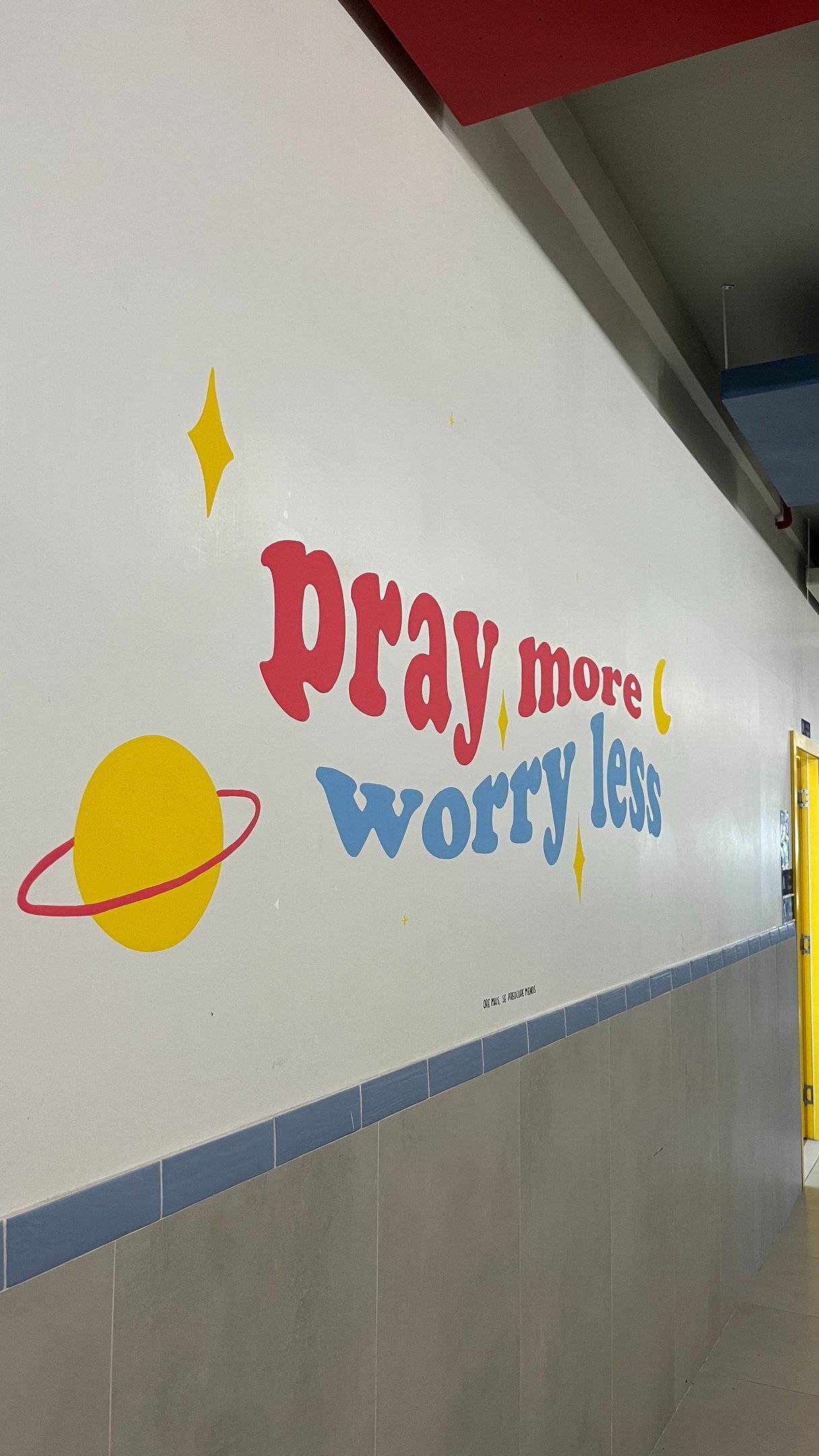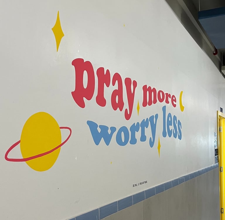 Foram cinco artes no colégio e iniciamos com as pinturas das frases nos corredores. A ideia era trazer frases cristãs e com um formato divertido do lettering, sempre trazendo a tradução em português, já que o colégio tem o sistema bilíngue.