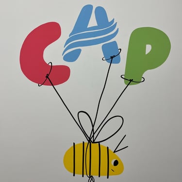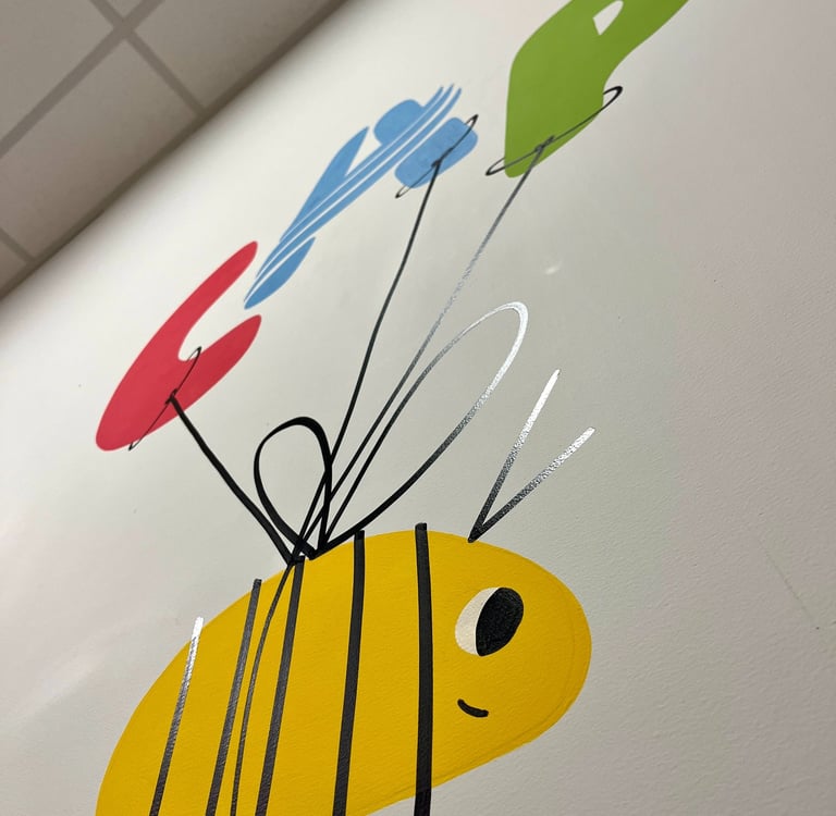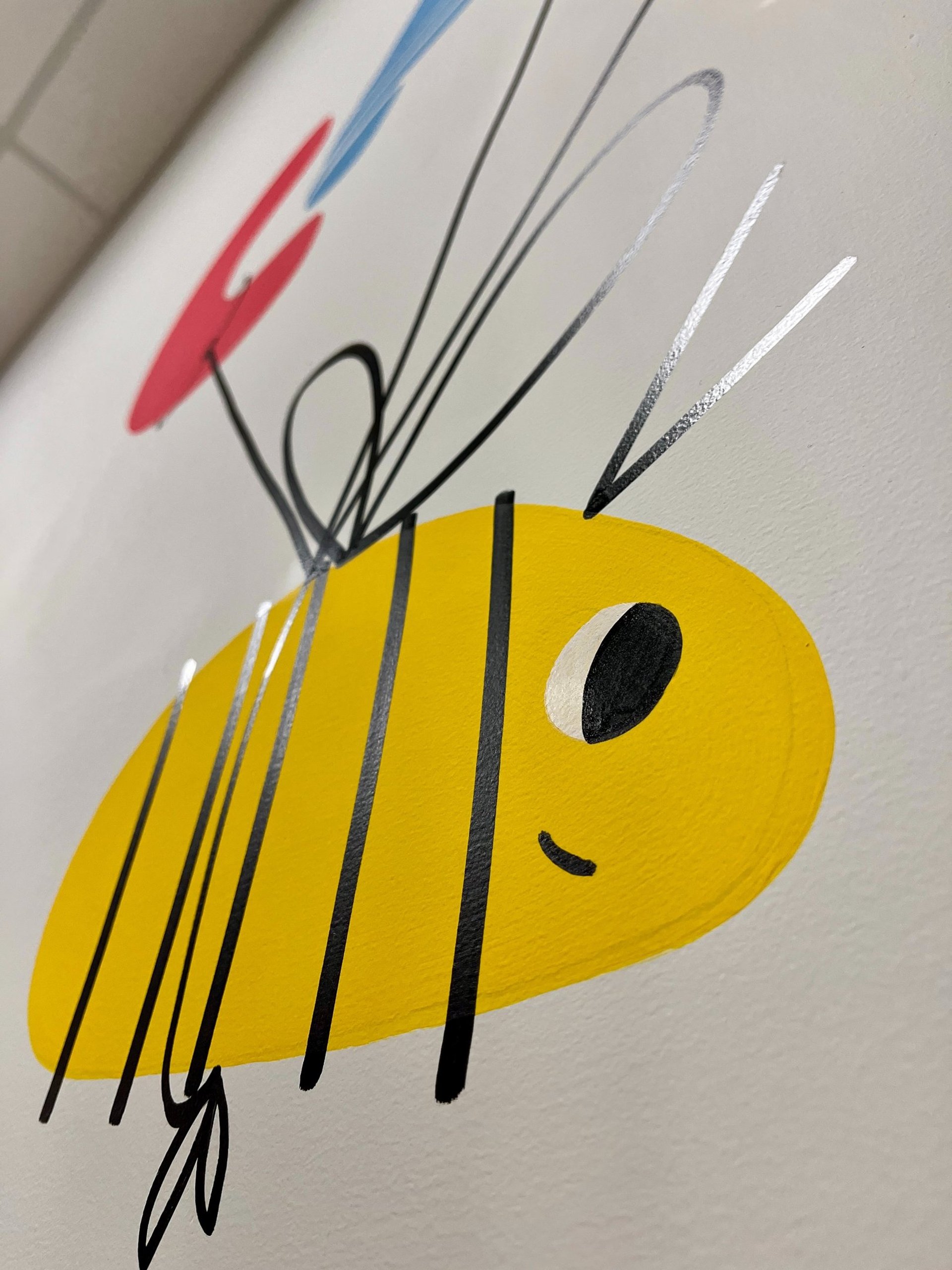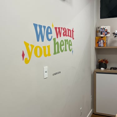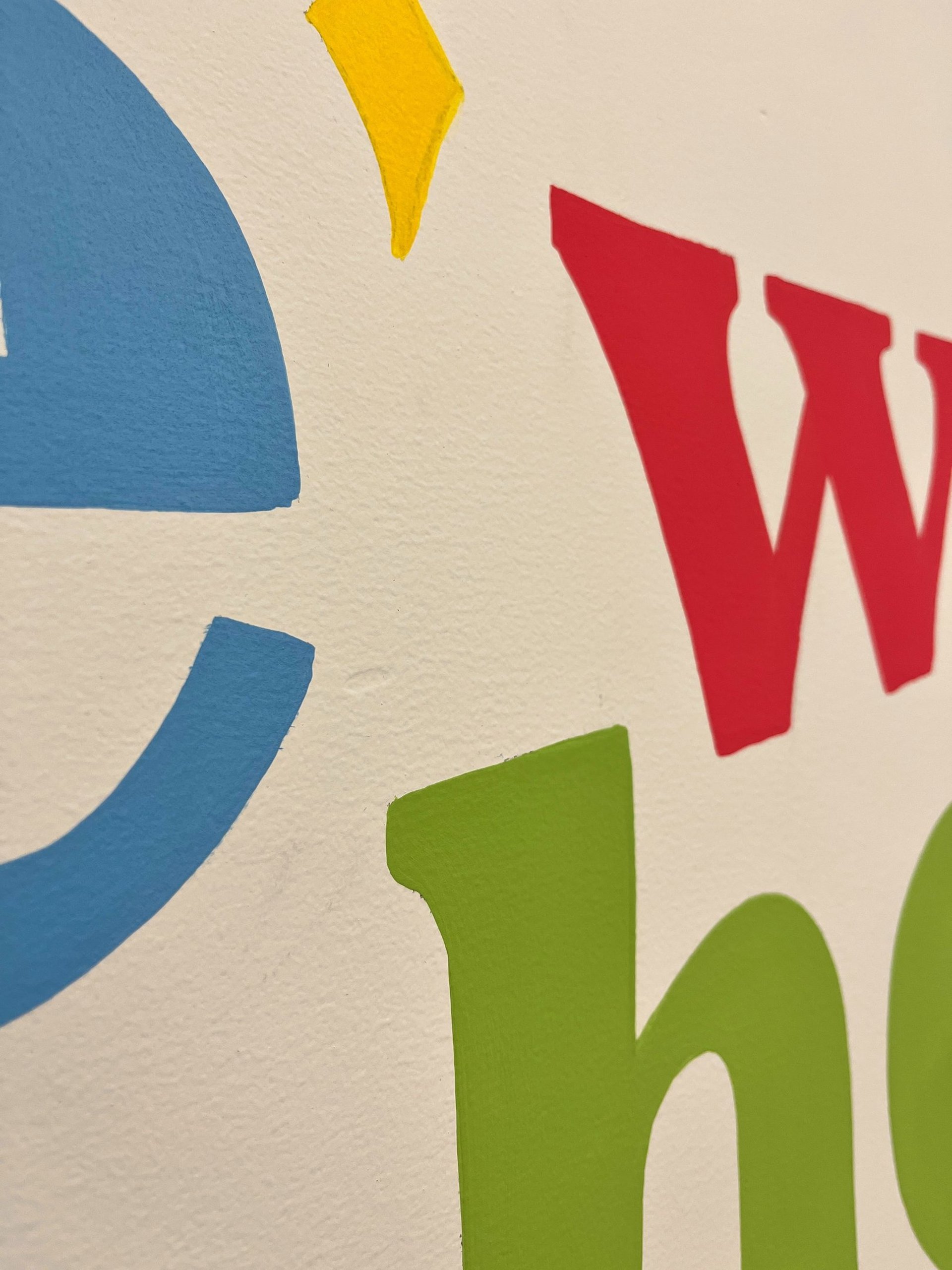 A ideia era uma frase bem colorida em inglês logo na entrada, para chamar a atenção dos que entram pela primeira vez. Já na lateral direita, uma frase mais sóbria que fica bem na linha de visão dos pais.
