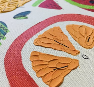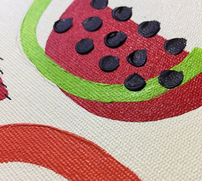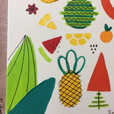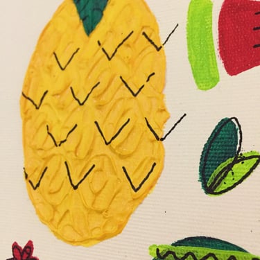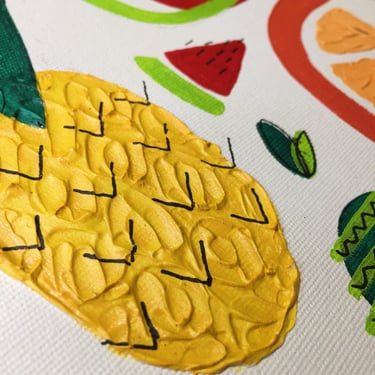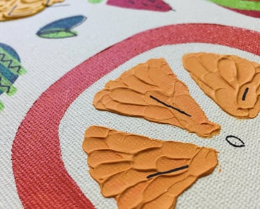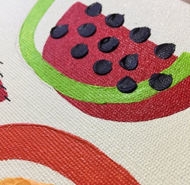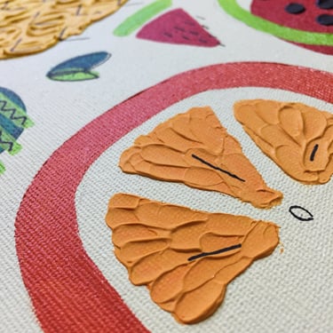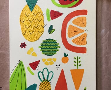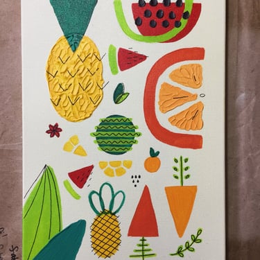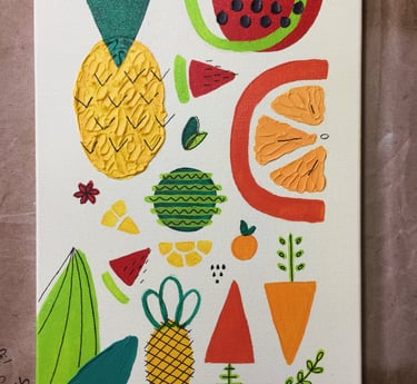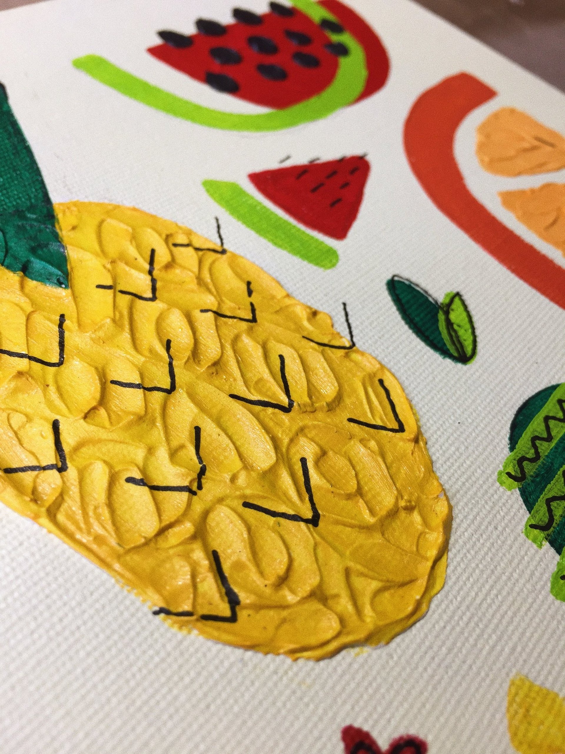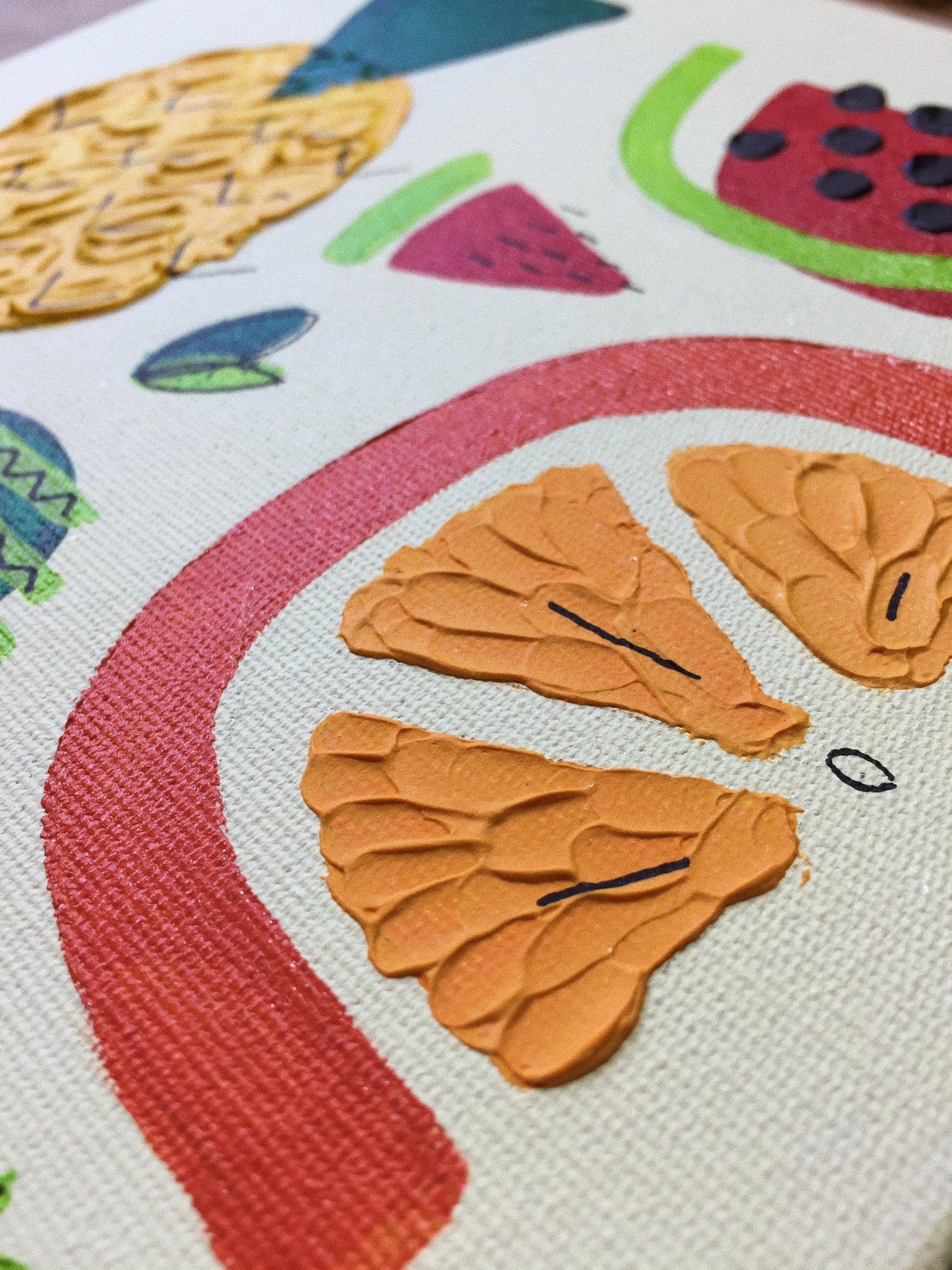 O conceito é baseado nas frutas favoritas delas, pintado de forma minimalista, dispersas e texturizada. Além das frutas, colocamos ali no meio duas cenouras, uma homenagem ao gatinho da família com o mesmo nome (deixei aqui em baixo o link do instagram com o conceito que mostra a foto do gatinho).