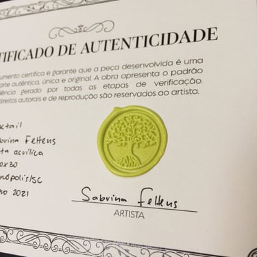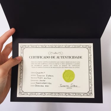 Quanto ao certificado de autenticidade, esse foi o primeiro quadro com a formatação atual utilizada! Antes vinha grudado na parte traseira da obra mas a selagem da cera estragava a parte frontal do quadro, então mantive ela em um envelope para comprovar a originalidade da obra (e a cor de selo não foge na paleta, viu?).