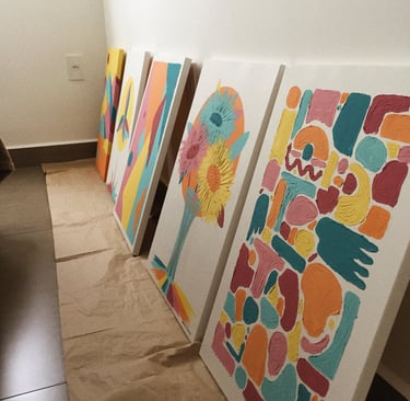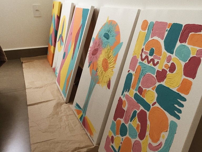 Por último, decidi fazer um quadro abstrato, sem esboços algum. Então misturei as pastas com as tintas e apenas fiz, da mesma forma que a vida é pra mim: colorida, cheia de momentos grandes ou pequenos, de várias formas e principalmente do jeito que só a vida é, inesperada. Assim surgiu o quinto e último quadro - Life Itself (DISPONÍVEL)