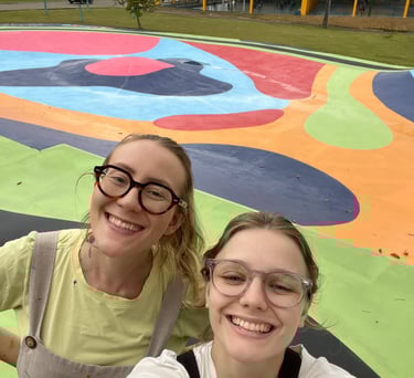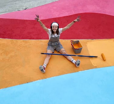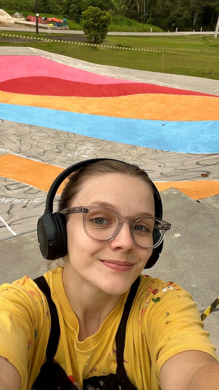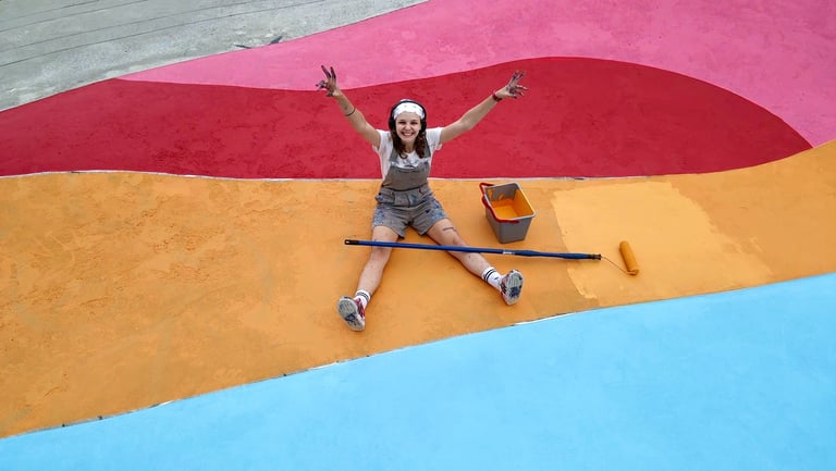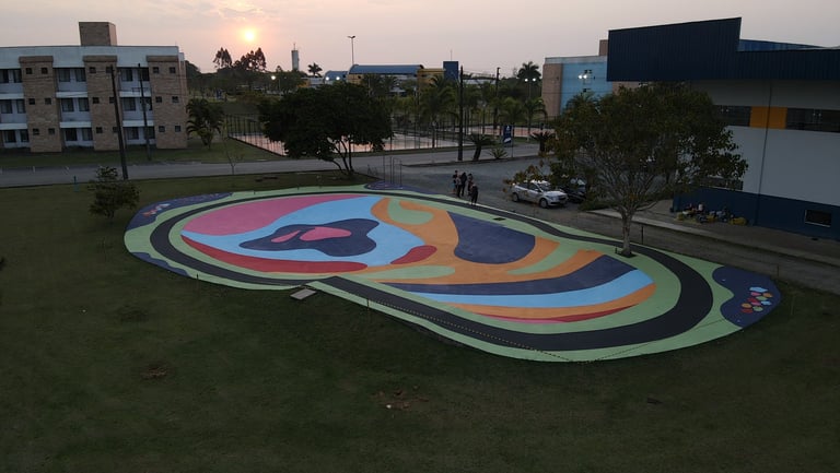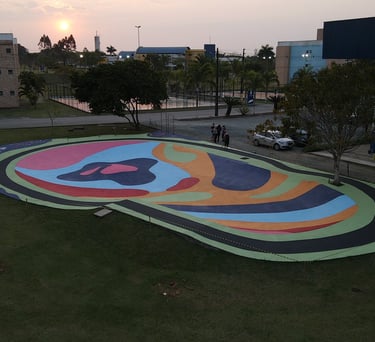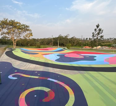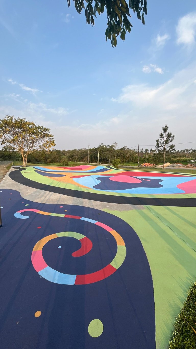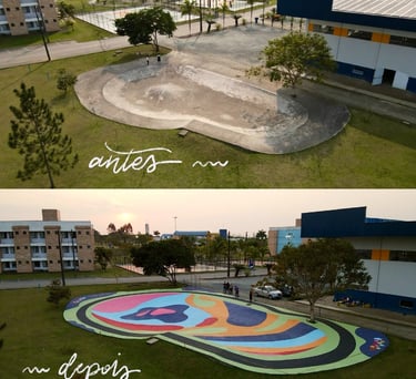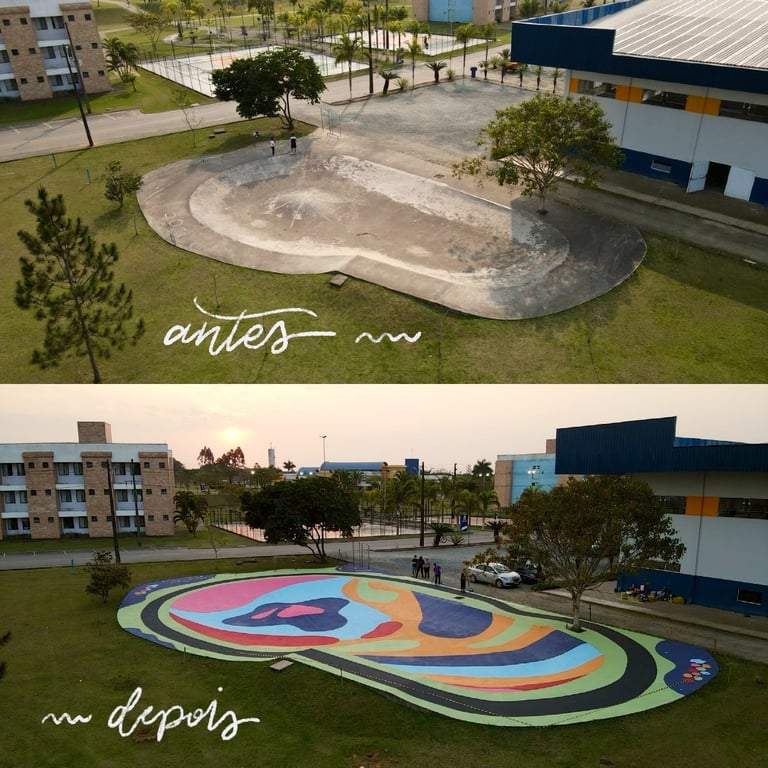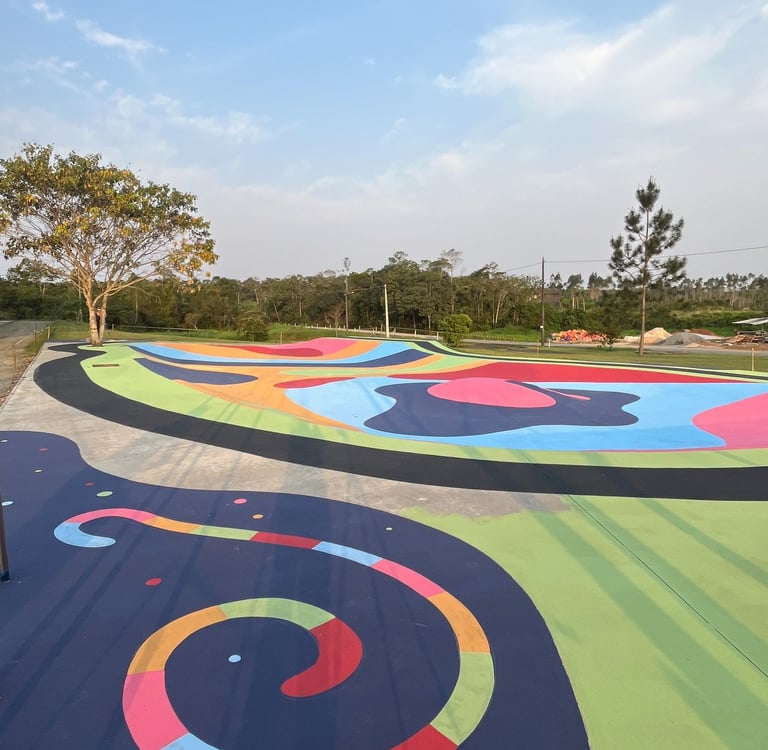 O primeiro desafio foi o tamanho. A pista tinha quase 500m² e decidimos pintar com cores divertidas e chamativas. Porém, decidimos usar a tinta piso para aumentar a durabilidade da arte, mas ela só havia cores básicas de demarcação. Então foram algumas aulas de matemática gastas aqui pra combinar a mistura de tintas e criar cores novas do zero.